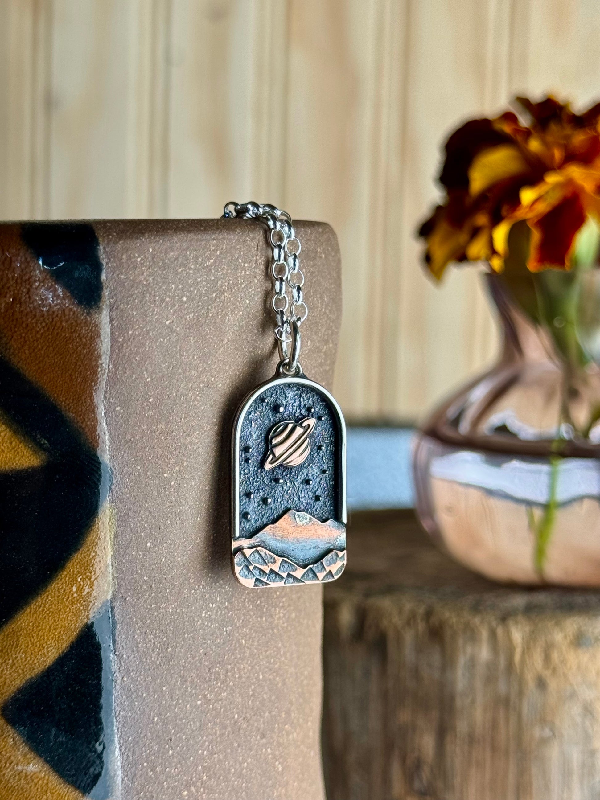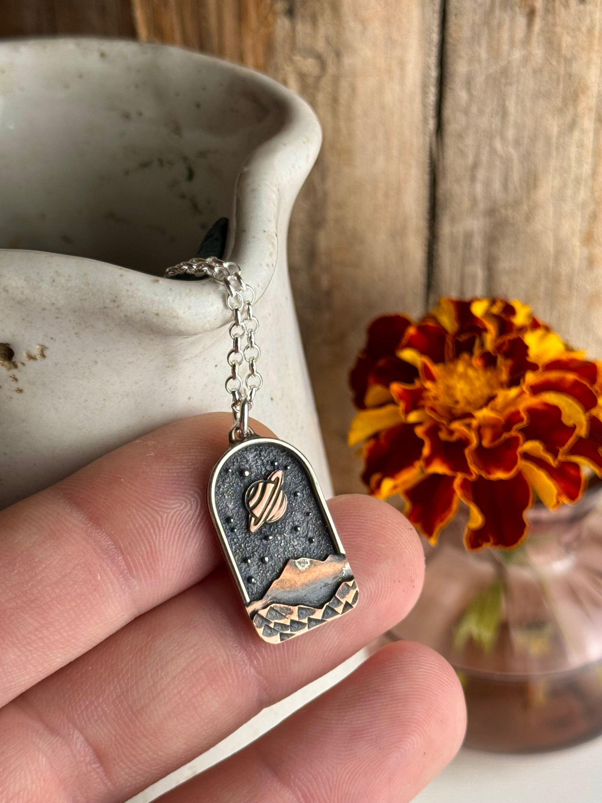 I draw each of these out by hand, cut and solder them together. Then I file, sand, stamp, darken and polish each one. They are sterling silver on the back, two layers of copper on top, with silver and 14k gold fill moons. Each one is completely unique and meant to represent the mountains, hills and hollers of Appalachia. Comes with a 18” sterling silver chain.