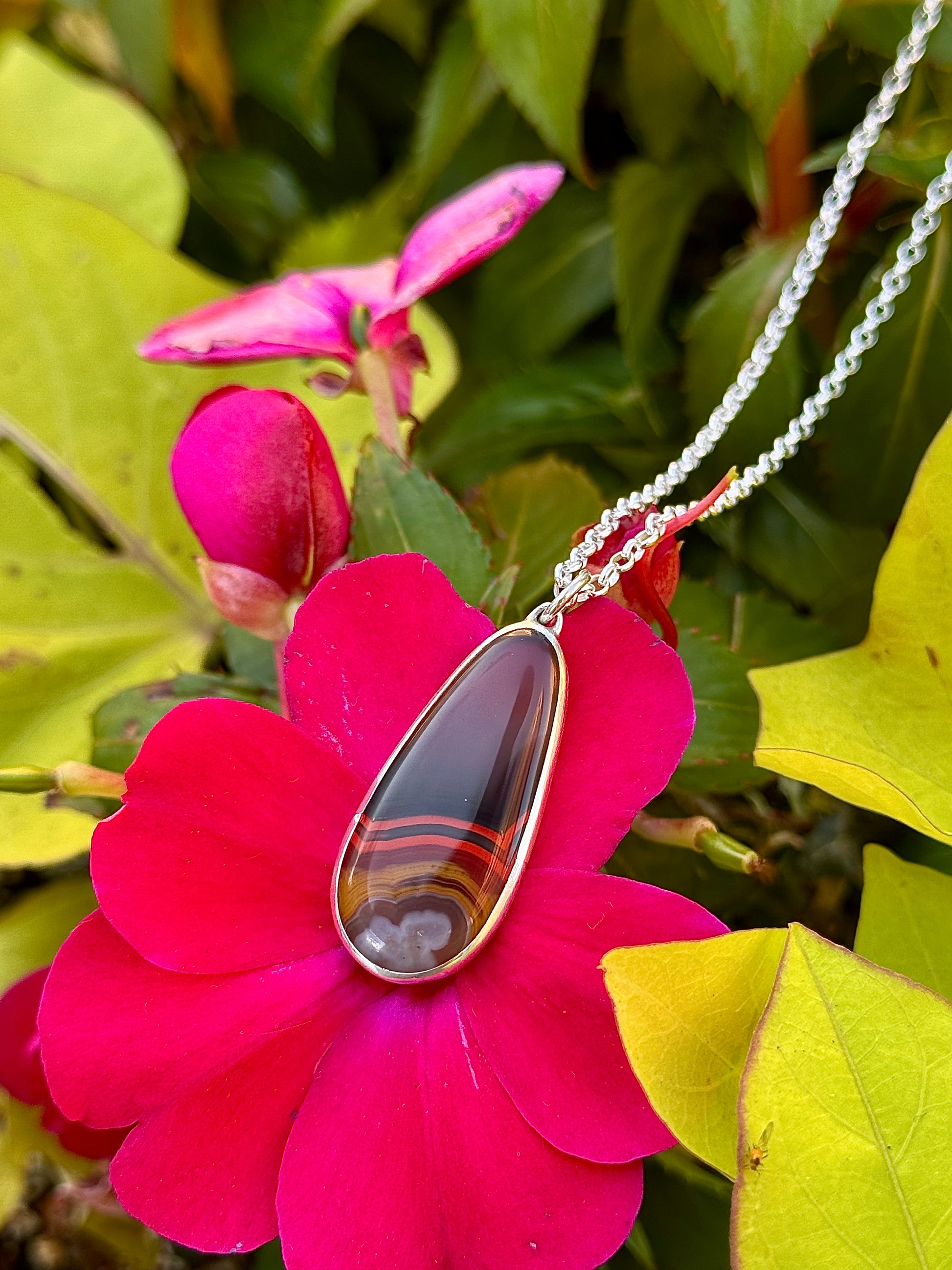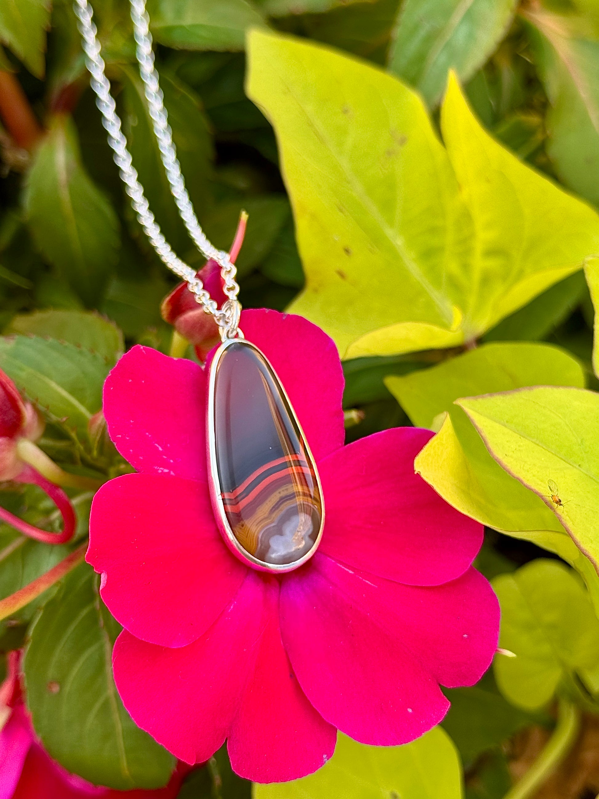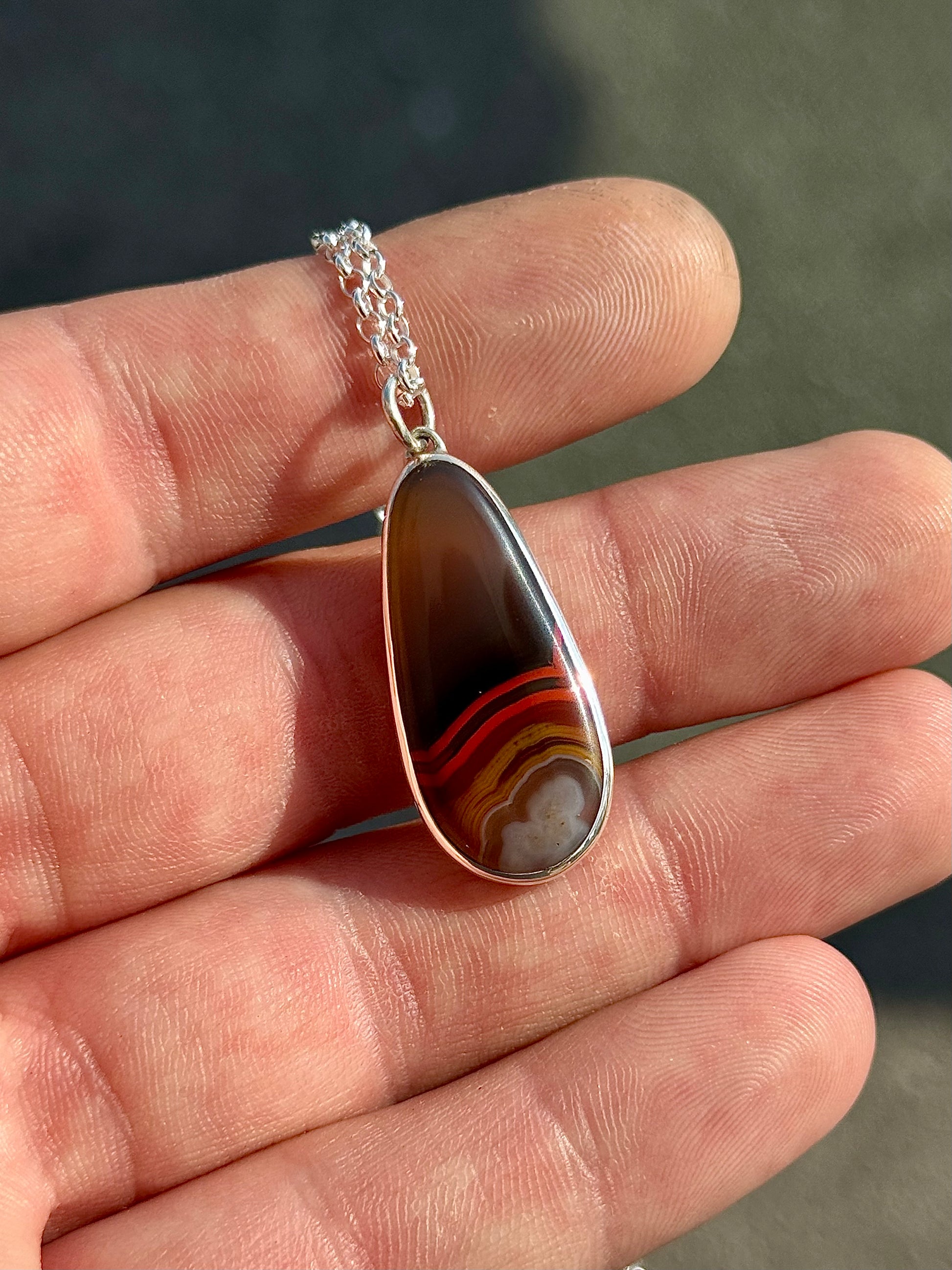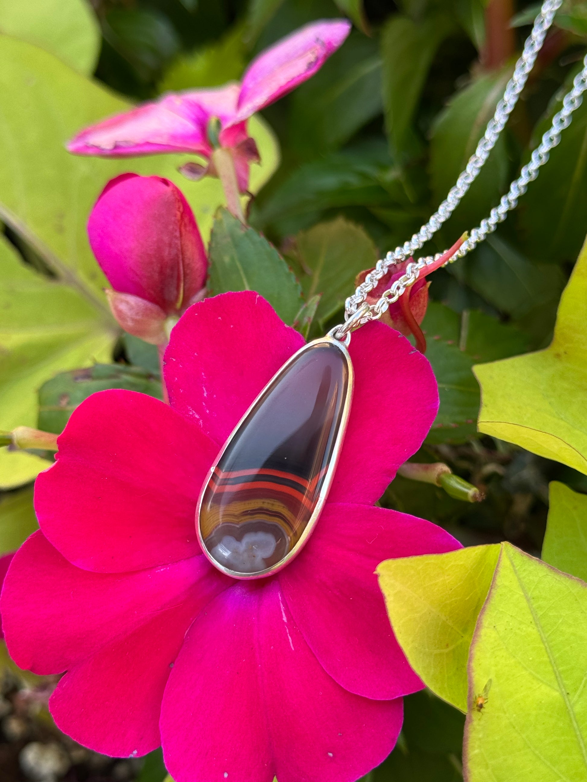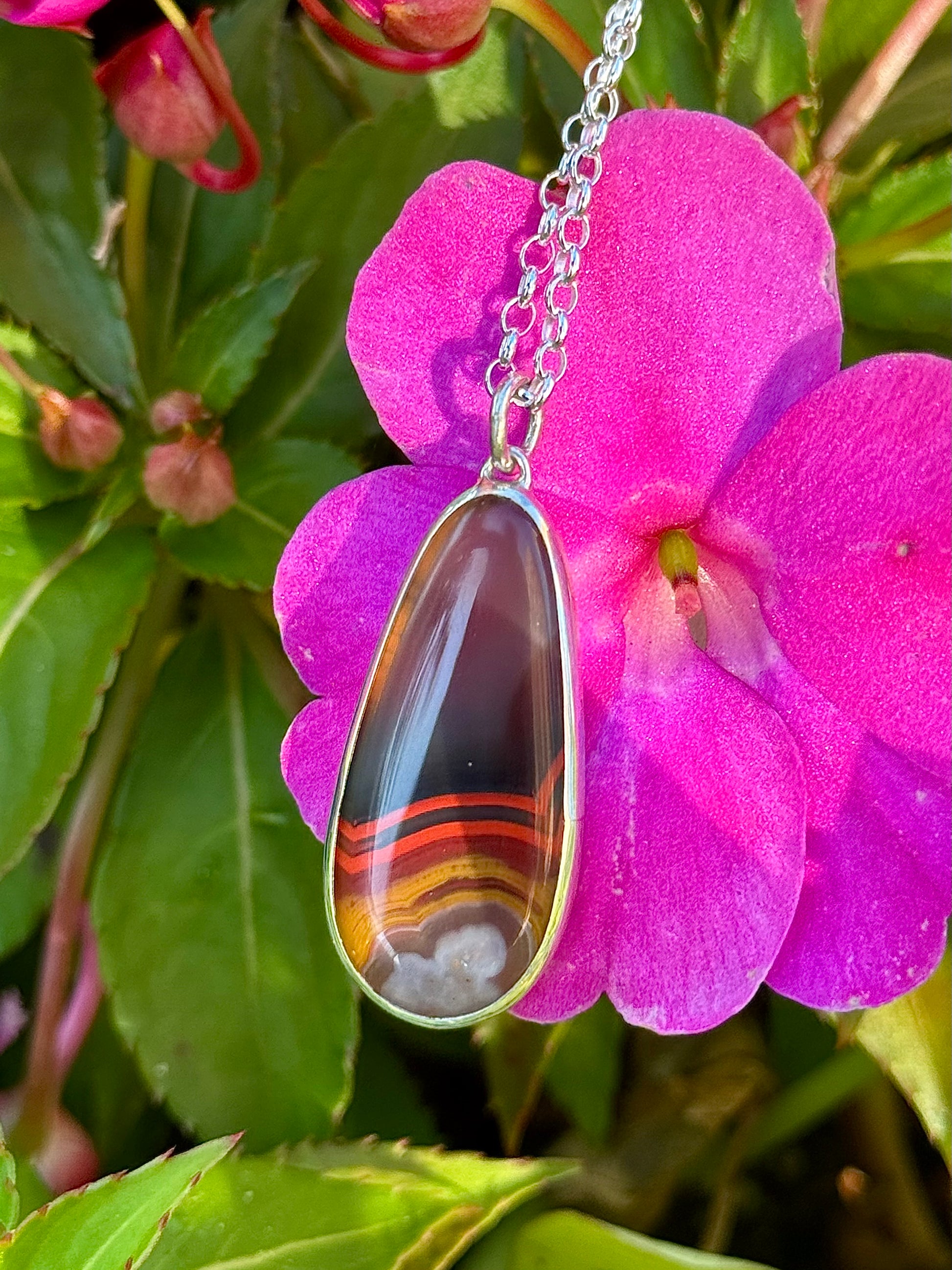 I cut and polished this stone from the highest quality Kentucky Agate. It’s one of a kind, set in .925 sterling silver on a 20” sterling chain.