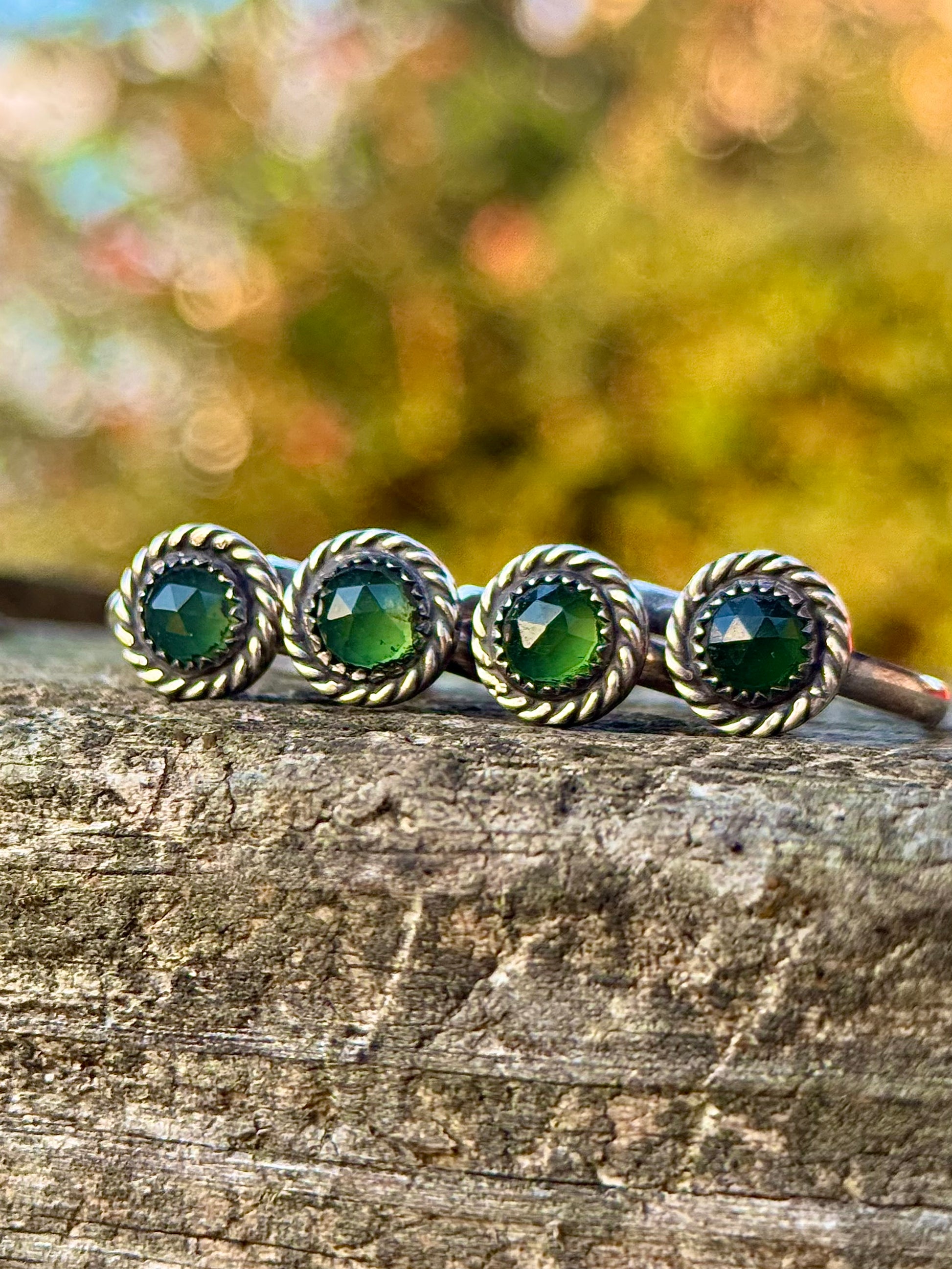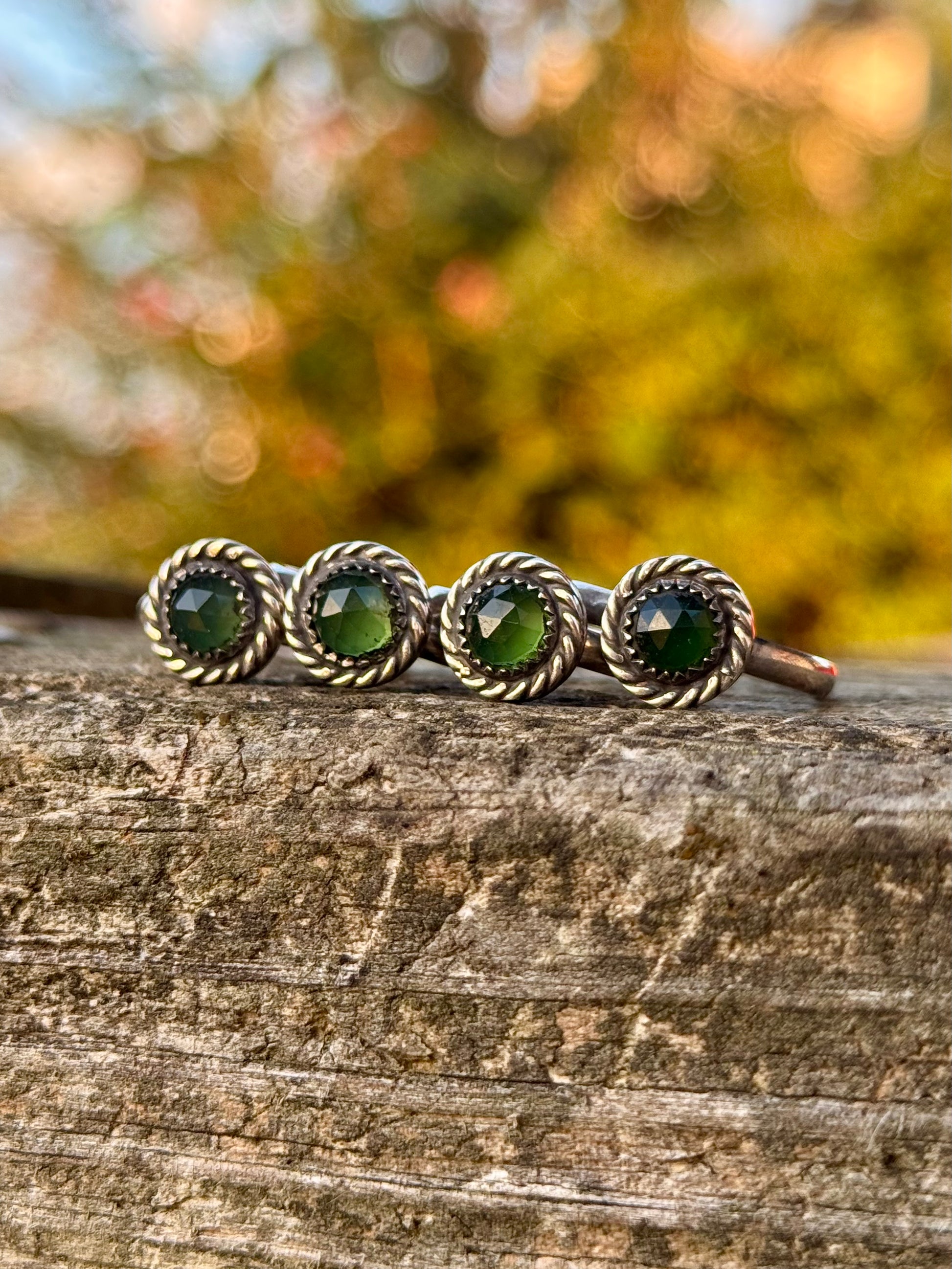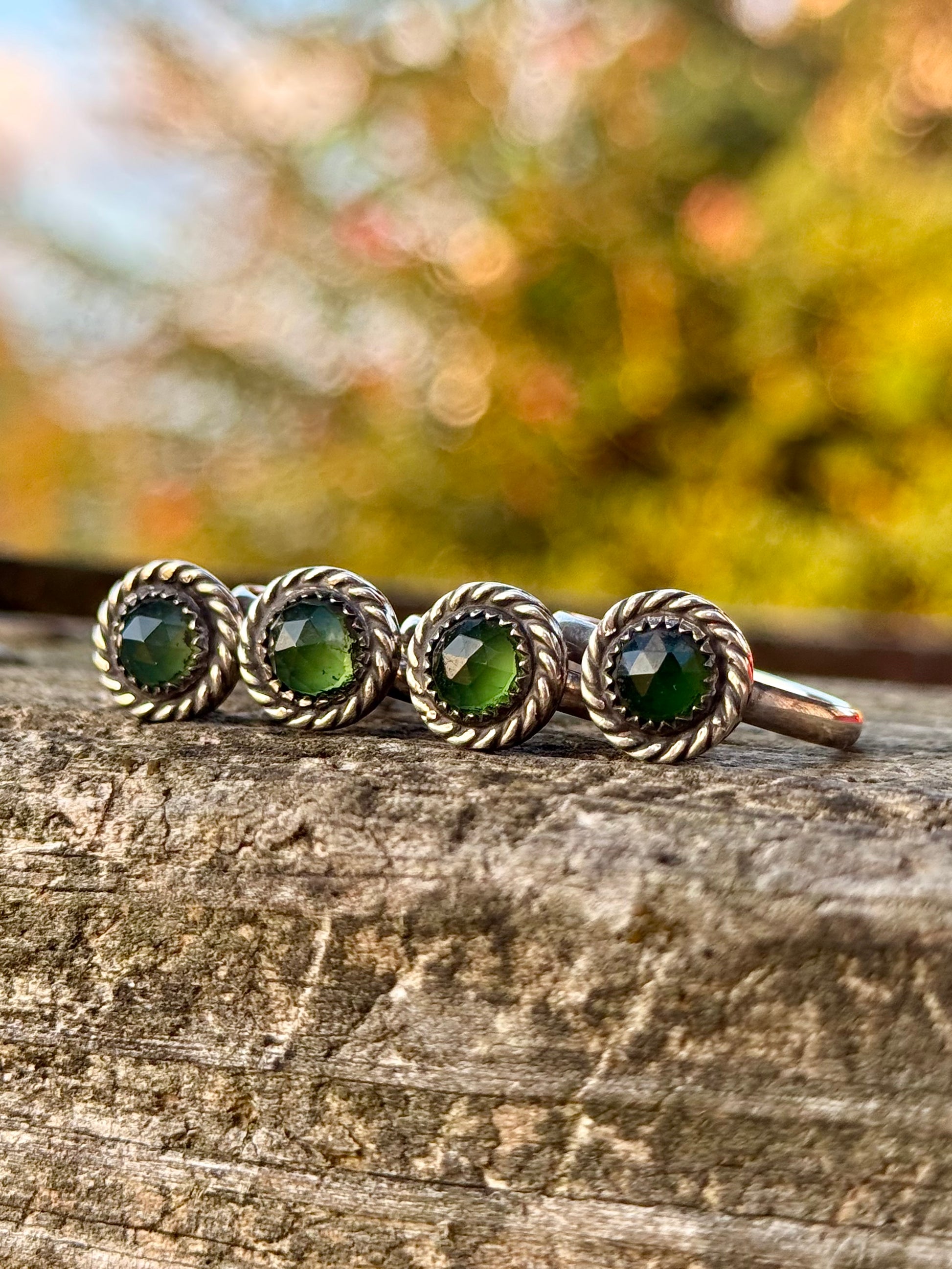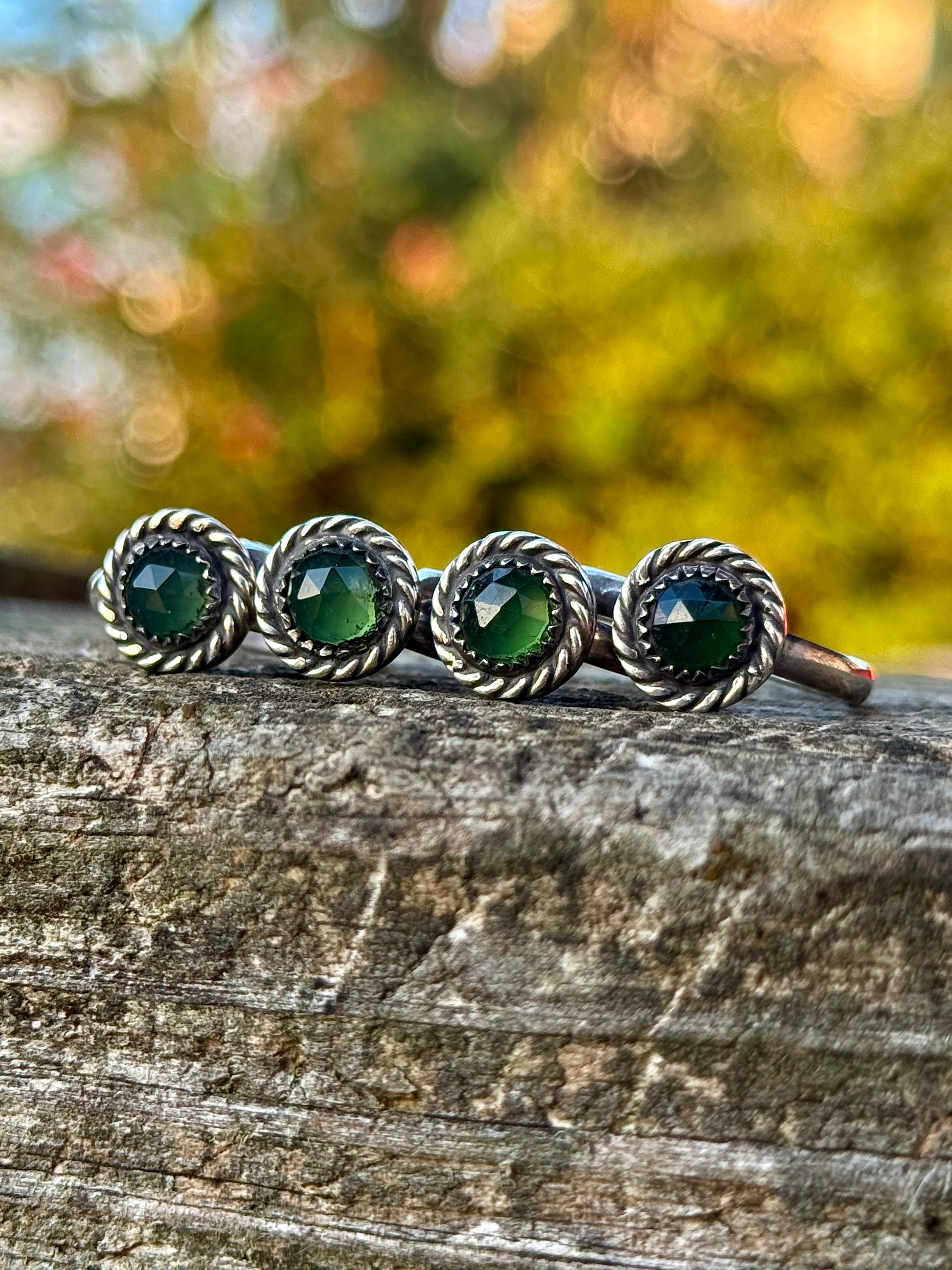 I made this series of green serpentine rings handcrafted with sterling silver. Each setting measures approximately 10mm.